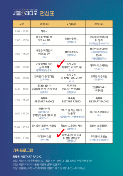 같은 날 2시, 서울인라디오의 일환으로 진행되는 tbs 최일구의 허리케인 라디오(FM 95.1)에도 피다영이 게스트로 출연합니다.