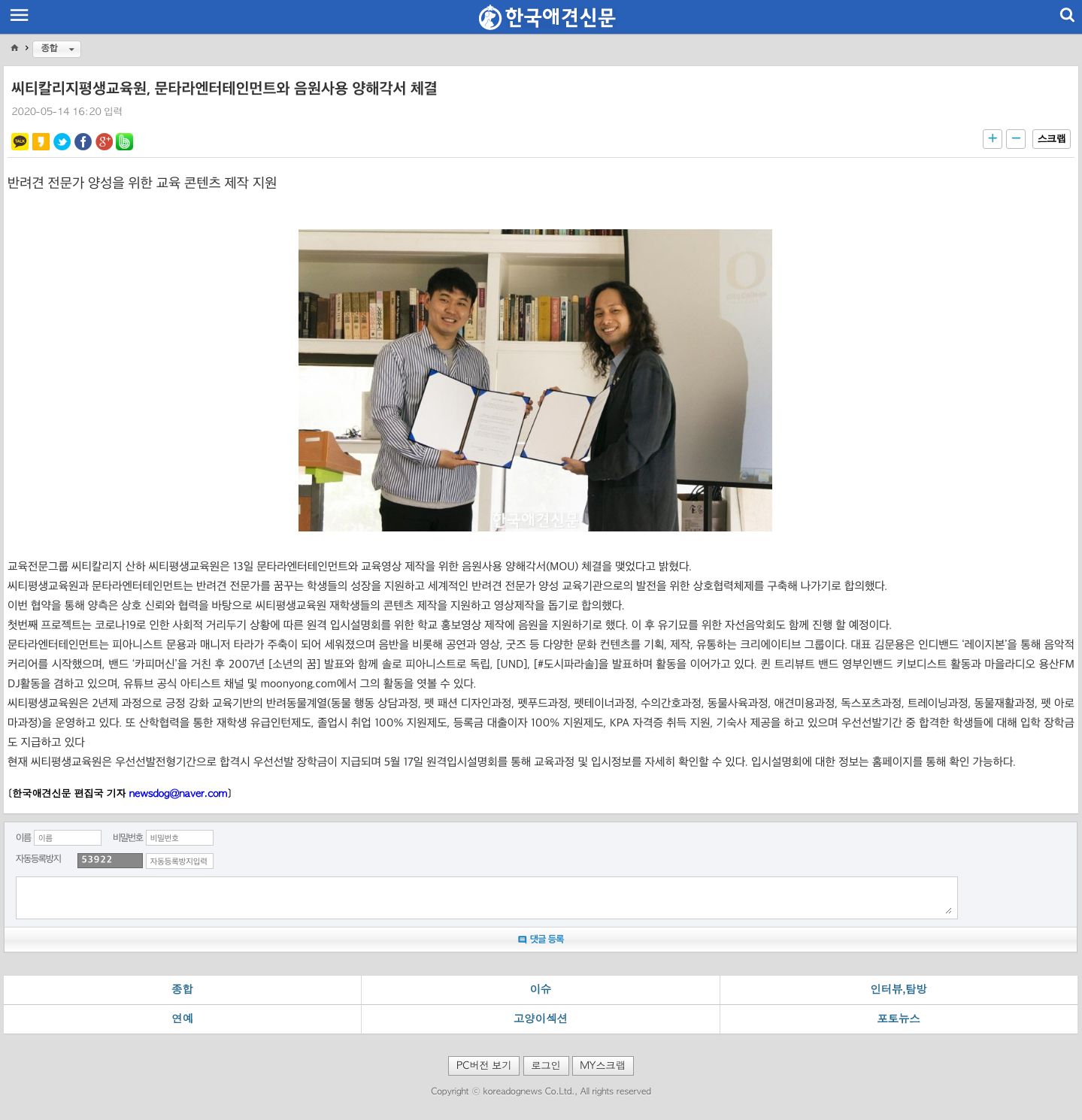 씨티칼리지평생교육원, 문타라엔터테인먼트와 음원사용 양해각서 체결 – 한국애견신문