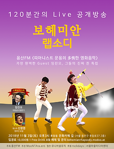 특집 공개방송 <보헤미안 랩소디> 용산FM 피아니스트 문용의 多情한 영화음악32회 퀸 팬이라면 주목 ! ATTENTION ! 대중음악평론가 임진모 선생님과 함께 하는 ! 팟캐스트 ♪싱어롱♬ 공개방송 🎙보헤미안 랩소디 🎉 퀸 팬들이 목 빠지게 기다렸던 그 영화! 보헤미안 랩소디 드디어 대개봉!! 영화 이야기 나누면서 OST를 함께 불러요~ . === 방송 정보 === ▶️2018.11.3 SAT 3pm~5pm . ▶️후암동 문화카페 길 (용산구 후암로37 2층) ▶️입장료 1만원(1free drink 음료or맥주) ▶️예매신청 및 문의 bohemianrhapsody.modoo.at - 퀸 트리뷰트 밴드 영부인밴드 보컬 신창엽의 싱어롱 리딩! - 영부인밴드 키보디스트 문용의 피아노 반주! - 대한민국 음악평론가 NO.1 임진모 선생님이 전하는 퀸 이야기 까지! *재미있는 코너와 푸짐한 경.. 2018. 11. 3.